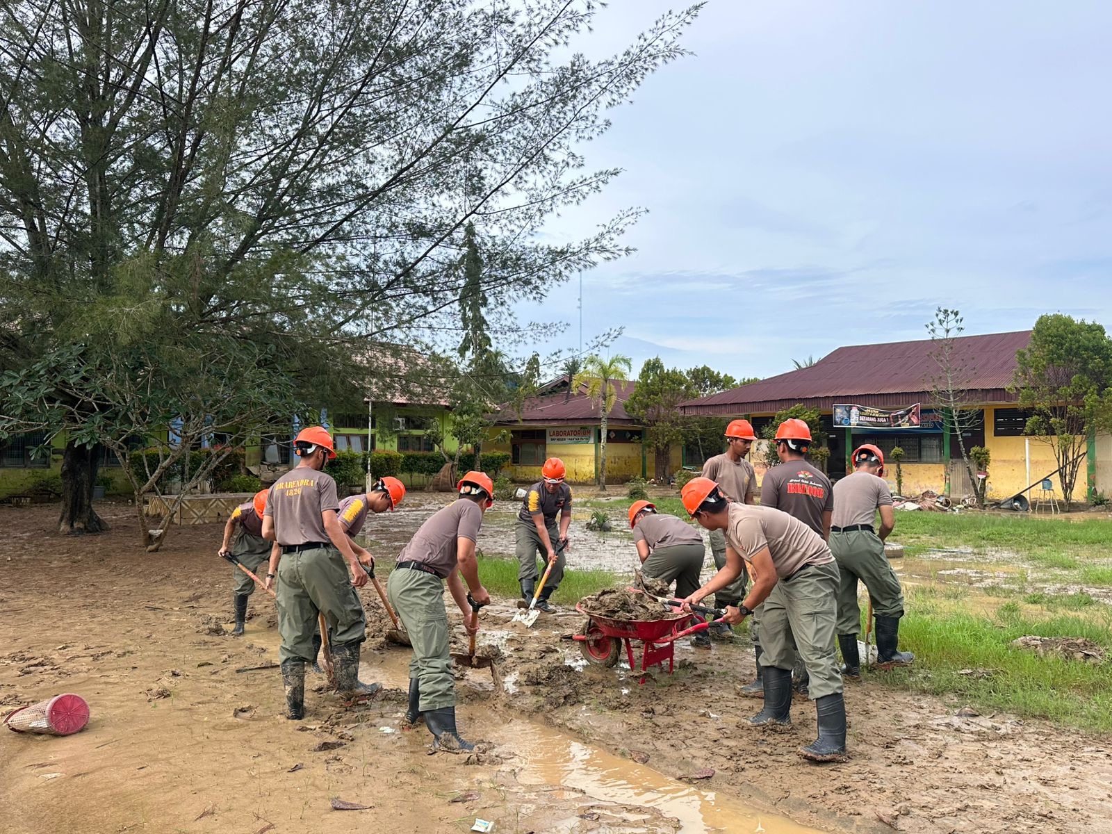 Kegiatan pembersihan ini dipimpin langsung oleh Iptu Andi Eka Saputra, S.E, bersama personel Brimob lainnya, dengan fokus membersihkan sisa-sisa material pasca bencana seperti lumpur, ranting pohon, dan sampah yang mengganggu aktivitas belajar mengajar serta lingkungan sekolah. Kehadiran personel Brimob disambut baik oleh pihak sekolah dan masyarakat sekitar yang turut merasakan dampak dari bencana alam tersebut.
