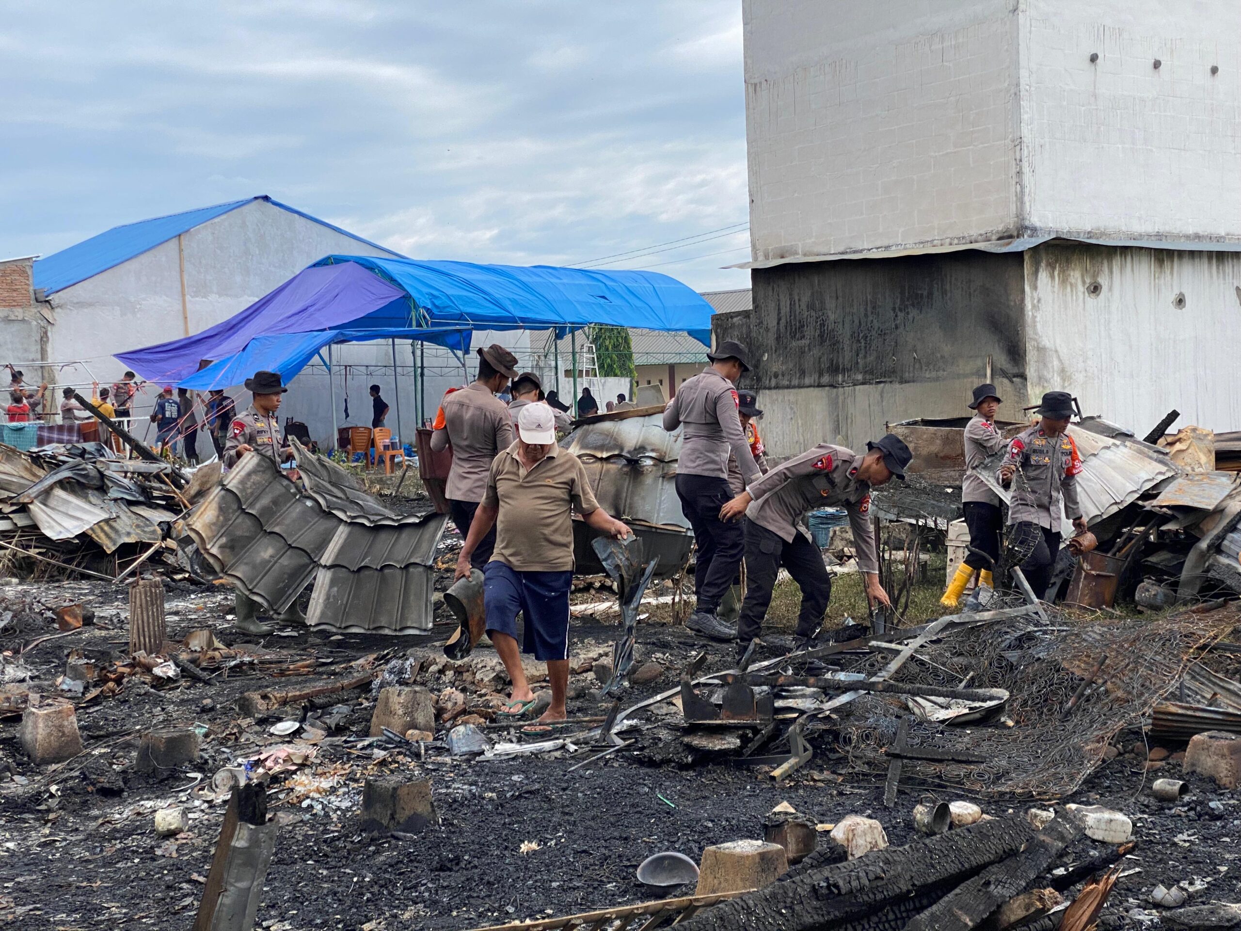 Dalam pelaksanaan kegiatan, personel Brimob bersama warga setempat bergotong royong membersihkan sisa-sisa material bangunan yang terdampak kebakaran.